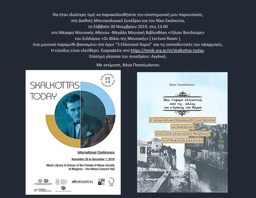 Διεθνές Μουσικολογικό Συνέδριο για τον Νίκο Σκαλκώτα, 30/11/ 2019, Μέγαρο Μουσικής Αθηνών - Μεγάλη Μουσική Βιβλιοθήκη «Λίλιαν Βουδούρη» του Συλλόγου «Οι Φίλοι της Μουσικής» [ Lecture Room ] Οι 5 Ελληνικοί Χοροί του Νίκου Σκαλκώτα μέσα από ένα μουσικό παραμύθι και οι εκπαιδευτικές τους εφαρμογές