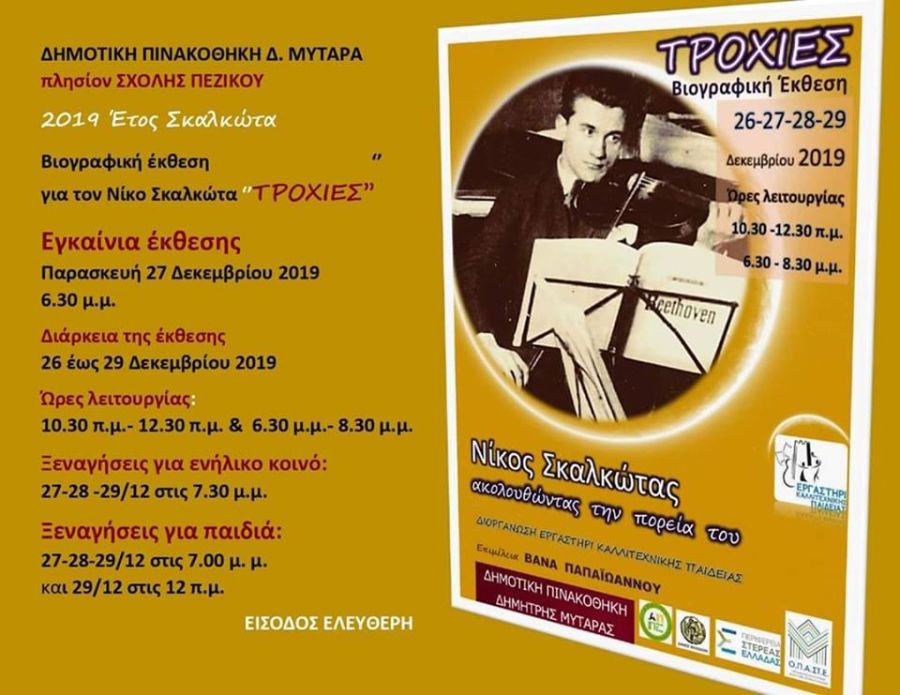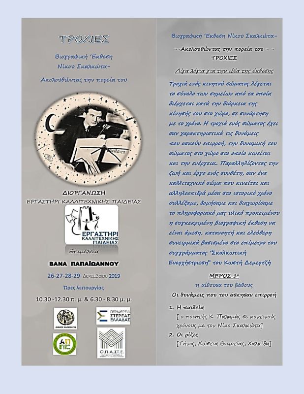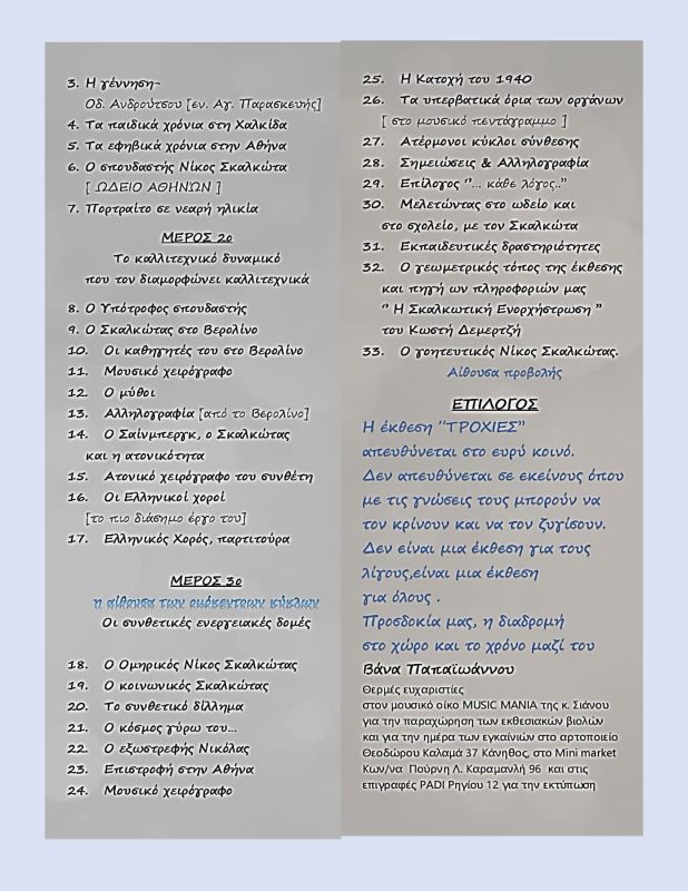Τροχιές ΙΙ Bιογραφική έκθεση ΄΄ΤΡΟΧΙΕΣ’’ - 36 τ.μ. εκτυπωμένων πληροφοριών για τον συνθέτη Ν. Σκαλκώτα απευθύνεται στο ευρύτερο κοινό με την προσδοκία μιας διαδρομής στο χώρο, στο χρόνο και την μουσική του.