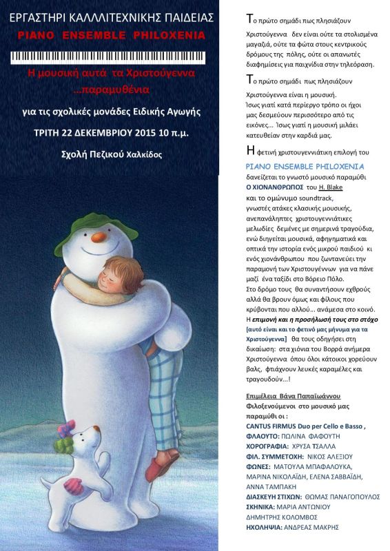 Έτσι λοιπόν αυτά τα Χριστούγεννα έγιναν ξεχωριστά για εμάς, αφού σε ξεχωριστό ακροατήριο θα παρουσιαστούμε! Μια και δύο όπως λένε τα παραμύθια αλλά και η παντοτινή αλήθεια ψάξαμε να βρούμε τα πιο πλούσια σε συναισθήματα μουσικά κείμενα, τους πιο ευαίσθητους στίχους τραγουδιών, τα πιο ανάλαφρα βήματα χορού και τον πιο ζεστό Χιονάνθρωπο του κόσμου!